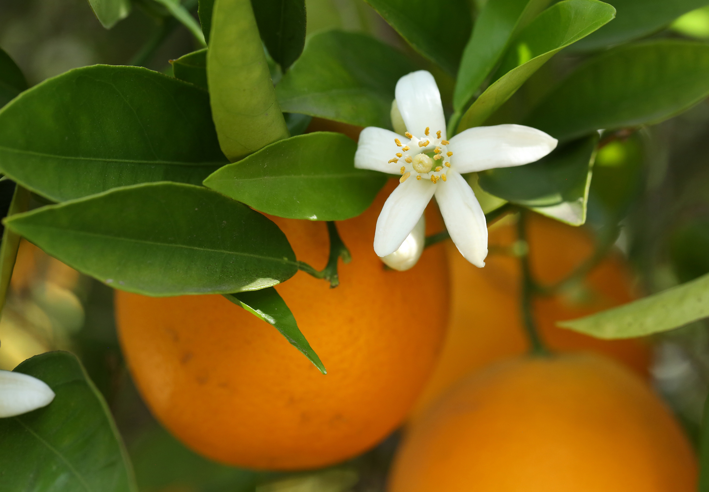 citrus tree closeup, leaves blossom and fruit 1000x600