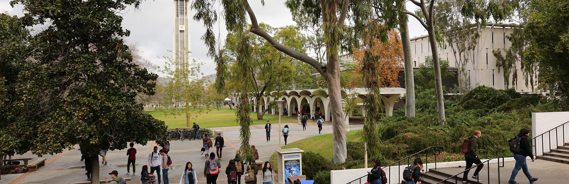 UCR Campus students walking Bell Tower in background 1920x624